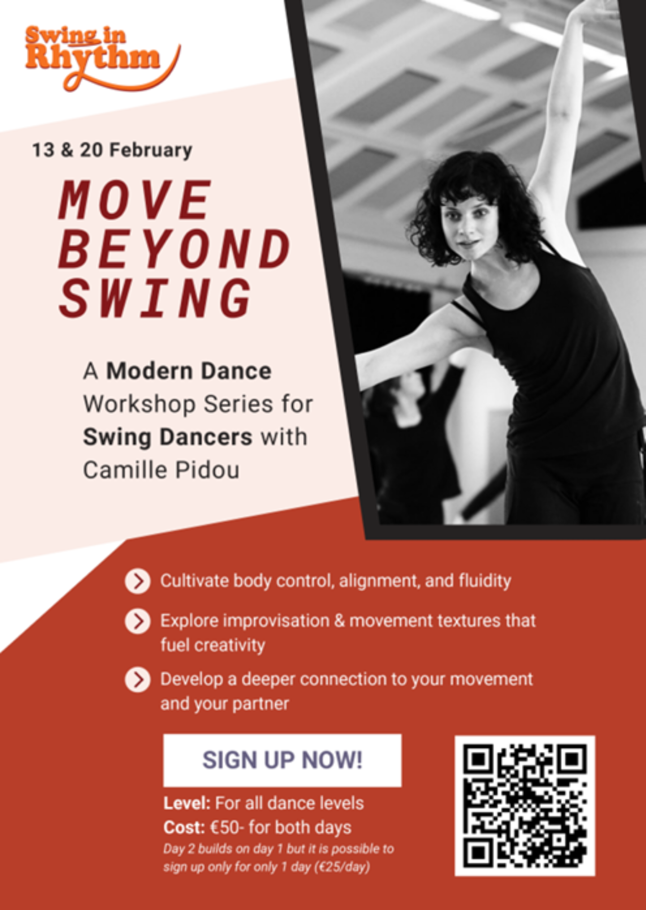 Join Camille for 2 transformative workshops where Lindy Hop meets Modern Dance in a series designed to unlock your body’s full potential.
